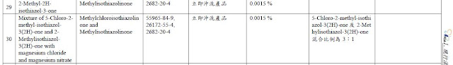 被認定與《化粧品衛生安全管理法》中的『化粧品防腐劑成分名稱及使用限制表』內,規範的Methylisothiazolinone(甲基異噻唑啉酮)及混合使用下Methylchloroisothiazolinone(甲基氯異塞唑晽酮) and Methylisothiazolinone(甲基異噻唑啉酮)在『立即沖洗產品』中的添加量及添加許可限制。
